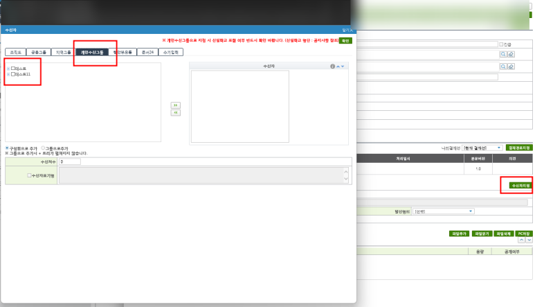- 개인수신그룹은 개인설정창에서 작성합니다.