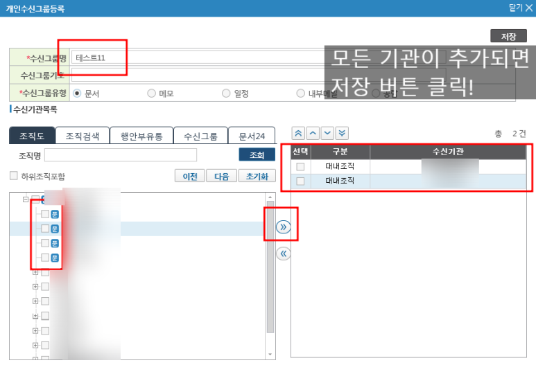 6. 오른쪽으로 원하는 기관이 모두 추가된 것을 확인하면 상단의 저장 버튼을 눌러 수신그룹을 저장해줍니다.